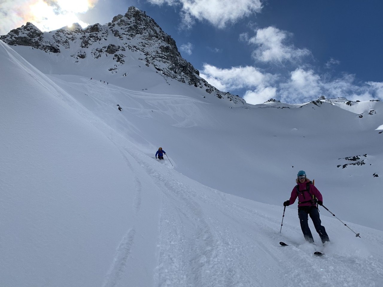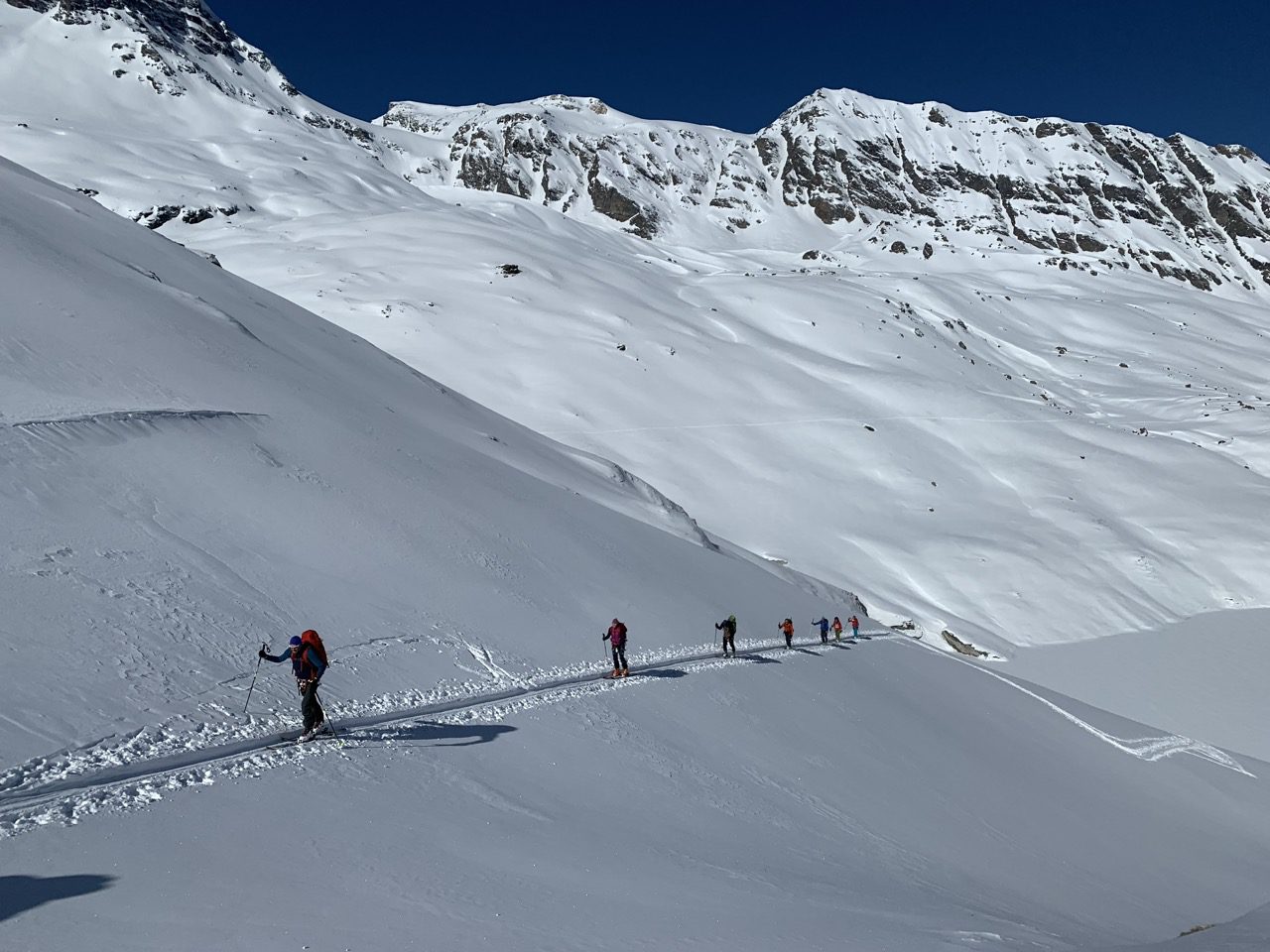 Participants have to be able to skin up and ski down up to 1500 vertical meters in a day and ski decent up to 35° in good conditions, moderate mountaineering skills (crampons and ice axe).
